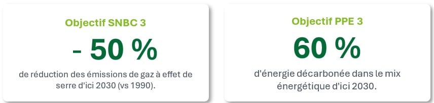 En novembre 2024, le Gouvernement français soumettait à la consultation publique les projets de la 3e version de la Stratégie Nationale Bas-Carbone (SNBC3) et de la Programmation Pluriannuelle de l’Énergie (PPE3). Les ambitions sont claires : une réduction des émissions de Gaz à effet de serre (GES) de 50 % d’ici à 2030 par rapport à 1990 via la SNBC3 (une ambition rehaussée par rapport à l’objectif de 40 % de la SNBC2 datant de 2020), et une transition vers un modèle énergétique décarboné à 60 % d’ici à 2030 grâce à la PPE.