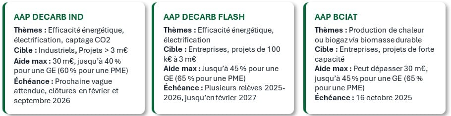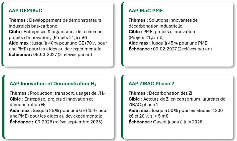 Ce dispositif phare soutient les projets d’envergure (plus de 3 m € d’investissement) avec une aide pouvant atteindre 30 m€. Les thématiques privilégiées demeurent l’efficacité énergétique, l’électrification des procédés et le captage du CO2 émis par les procédés industriels. Renouvelé en décembre 2024, la dernière édition s’est clôturée le 15 mai 2025. Une nouvelle ouverture des candidatures est attendue prochainement, avec des clôtures prévues en février et en septembre 2026.